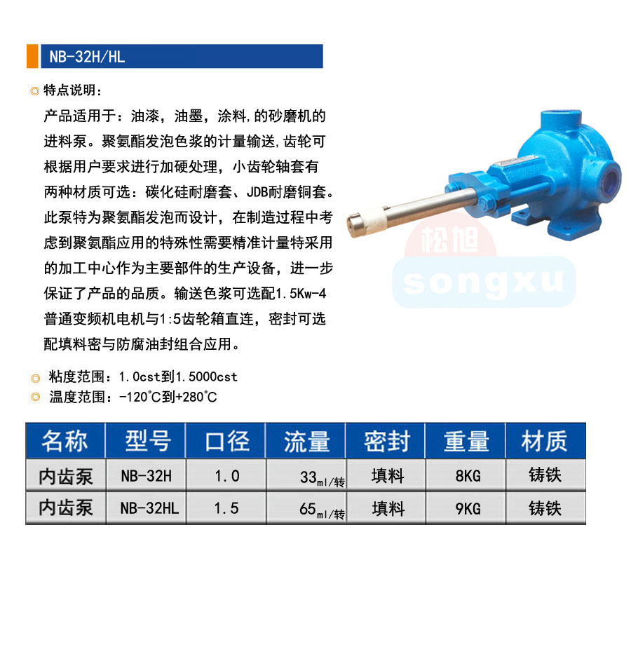 产品适用于:油漆,油墨,涂料,的砂磨机的 进料泵。聚氨酯发泡色浆的计量输送,齿轮可 根据用户要求进行加硬处理,小齿轮轴套有 两种材质可选:碳化硅耐磨套磨铜套。 此泵特为聚氨酯发泡而设计,在制造过程中考 虑到聚氨酯应用的需要精准计量特采用 的加工中心作为主要部件的生产设备,进一步 保证了产品的品质。输送色浆可选配1.5Kw-4 普通变频机电机与1:5齿轮箱直连,密封可选 配填料密与防腐油封组合应用。 、JDB耐