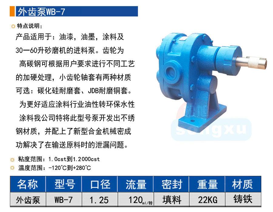 产品适用于:油漆,油墨,涂料及 30一60升砂磨机的进料泵。齿轮为 高碳钢可根据用户要求进行不同工艺 的加硬处理,小齿轮轴套有两种材质 可选:碳化硅耐磨套、JDB耐磨铜套。 为更好适应涂料行业油性转环保水性 涂料我公司特将此型号泵开发出不绣 钢材质,并配上了新型合金机械密成 功解决了在输送原料时的泄漏问题。